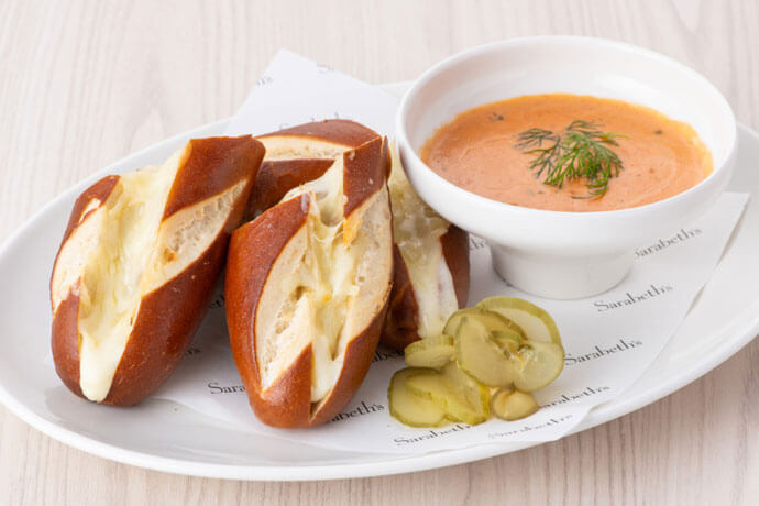 プレッツェルブレッド、ソテーオニオン、グリュイエールチーズ、ピクルス、トマトスープ -