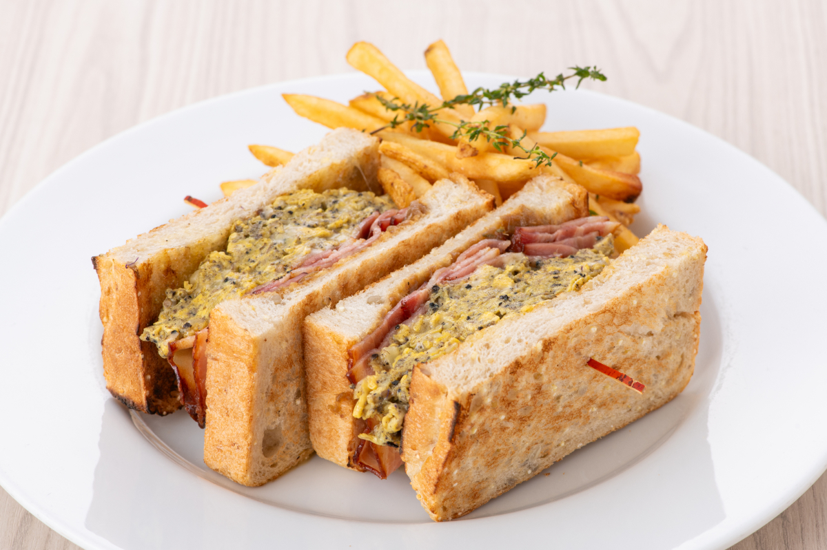 ヒマラヤトリュフ、ホワイトチェダーと共にふわふわに仕上げたスクランブルエッグと、香ばしいベイクドベーコン、甘さを引き出し丁寧にソテーしたオニオンをグレインブレッドでサンドしました。たっぷりのポテトとともに、豪快に頬張ってお召し上がりください。