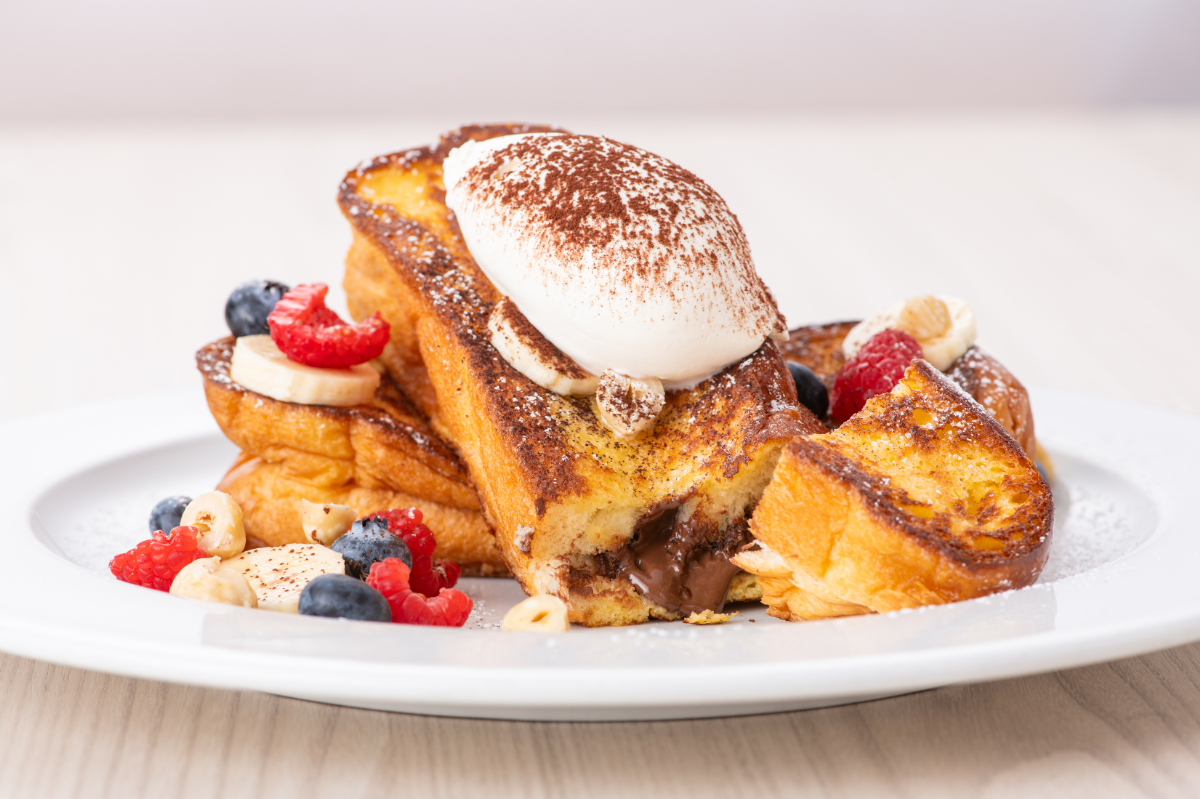 ヘーゼルナッツのプラリネペーストをあわせたジャンドゥーヤチョコレートを、ふんわりした食感と卵とバターの風味が楽しめるサラベス特製ハッラーブレッドでサンドして焼き上げたフレンチトースト。中からとろけ出る熱々のジャンドゥーヤチョコレートにはクッキーをフレーク状にしたロイヤルティーヌを加え、サクサクとした食感と香ばしい風味を心地いいアクセントにしています。たっぷりのホイップクリームとベリー、バナナ、ヘーゼルナッツのトッピングと一緒にお楽しみください。