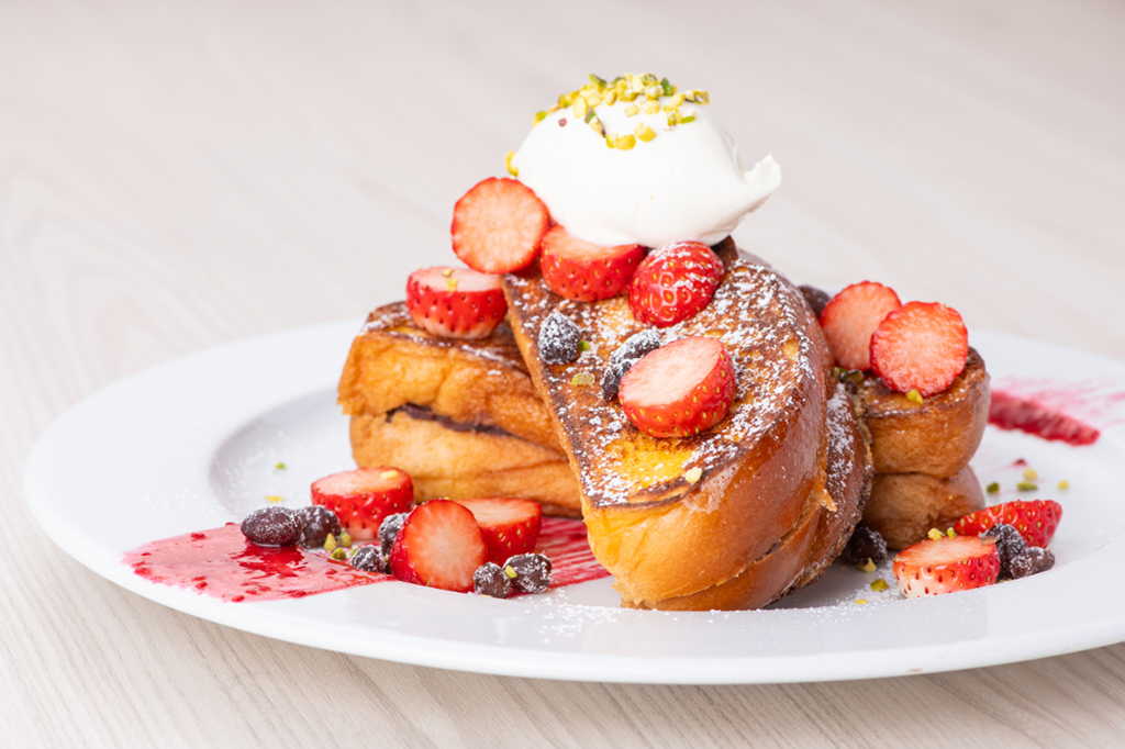 サラベス特製の卵とバターの香りがふんだんに広がるふわふわの“ハッラーブレッド”に、上品な甘さの小倉餡をサンドし、アパレイユにたっぷり浸して香ばしく焼き上げてた春限定のフレンチトースト。ほどよい塩気を加えたマスカルポーネホイップを贅沢にトッピングし、ストロベリーソースと合わせることで、甘みの中に爽やかな酸味が広がります。
