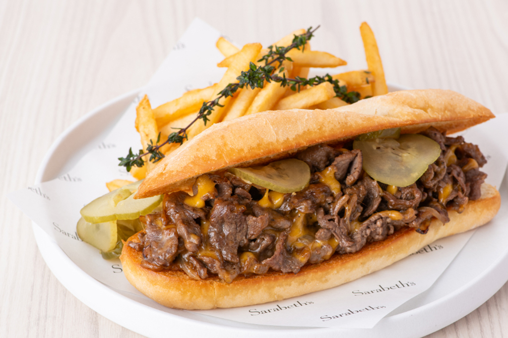 香ばしく焼き上げた牛肩スライスに甘みを引き出したソテーオニオンとコク深いレッドチェダーを合わせ、ピクルスのほどよい酸味で引き締めたフィリングを、外はカリッと中はふんわりのソフトバゲットにサンドし、仕上げにフレンチフライを添えました。アメリカ・フィラデルフィアの名物をサラベスらしく上品にアレンジした、季節限定メニューをぜひお楽しみください。